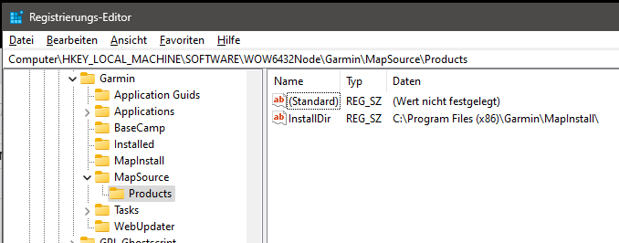 - für die alte 32bit Version: "HKEY_LOCAL_MACHINE\\SOFTWARE\\Garmin\\MapSource\\Families\\"