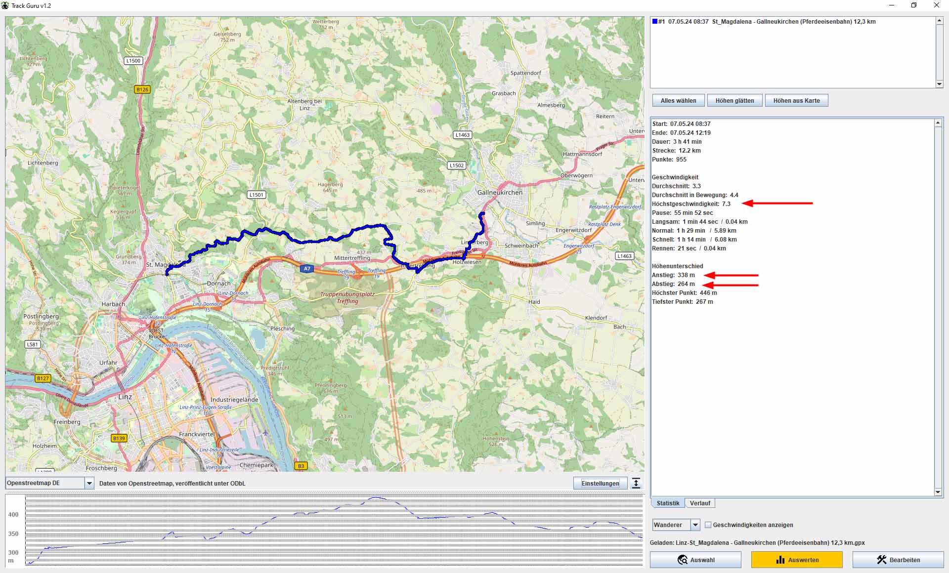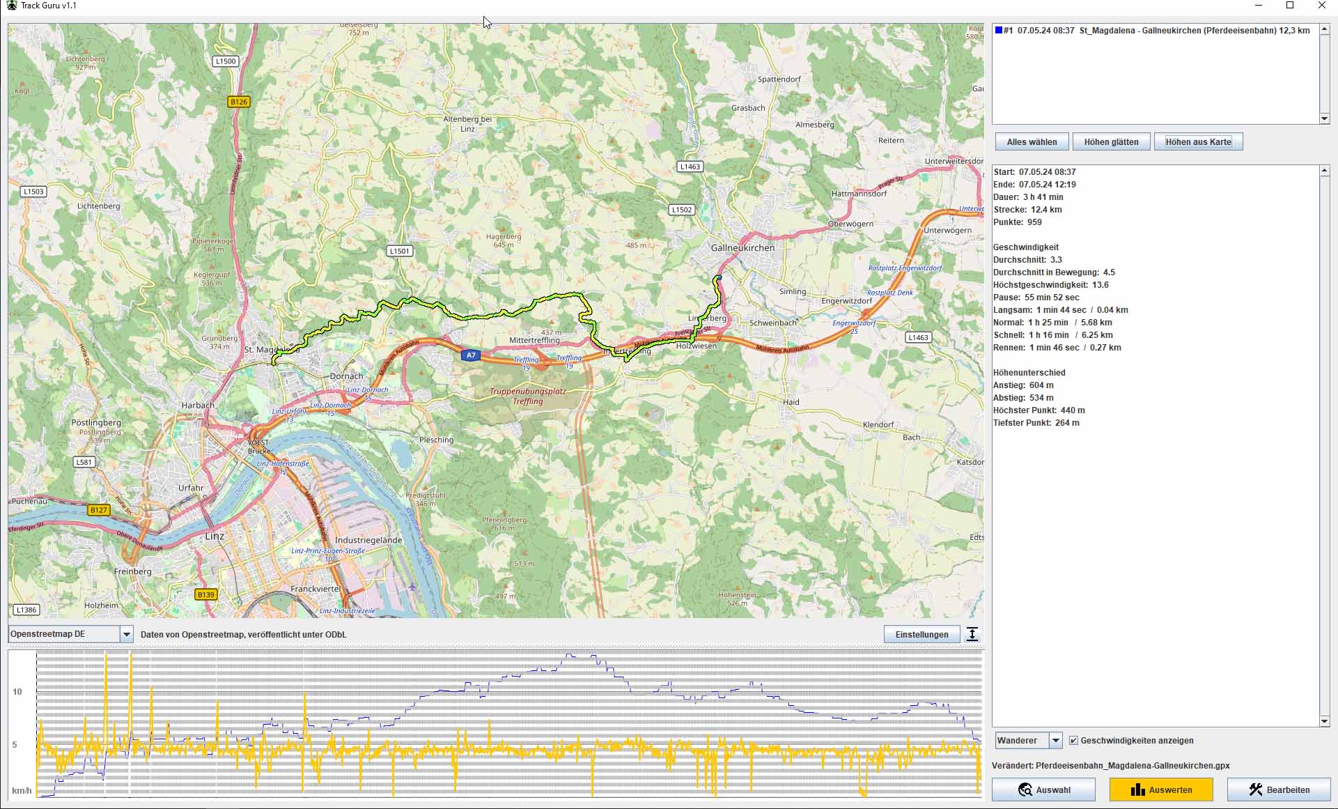 "Linz-St_Magdalena - Gallneukirchen (Pferdeeisenbahn) 12,3 km - GPS-Track-Analyse.gpx" (die Datei nach dem Glätten in GPS-Track-Analyse).
