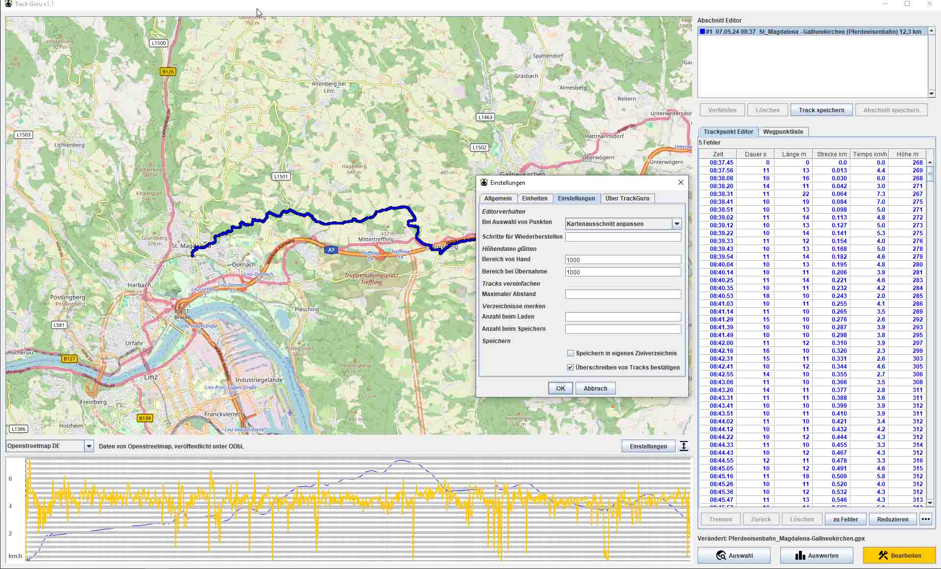 Mit der geglätteten Datei aus GPS-Track-Analyse funktioniert das Glätten auch in Track Guru wieder.