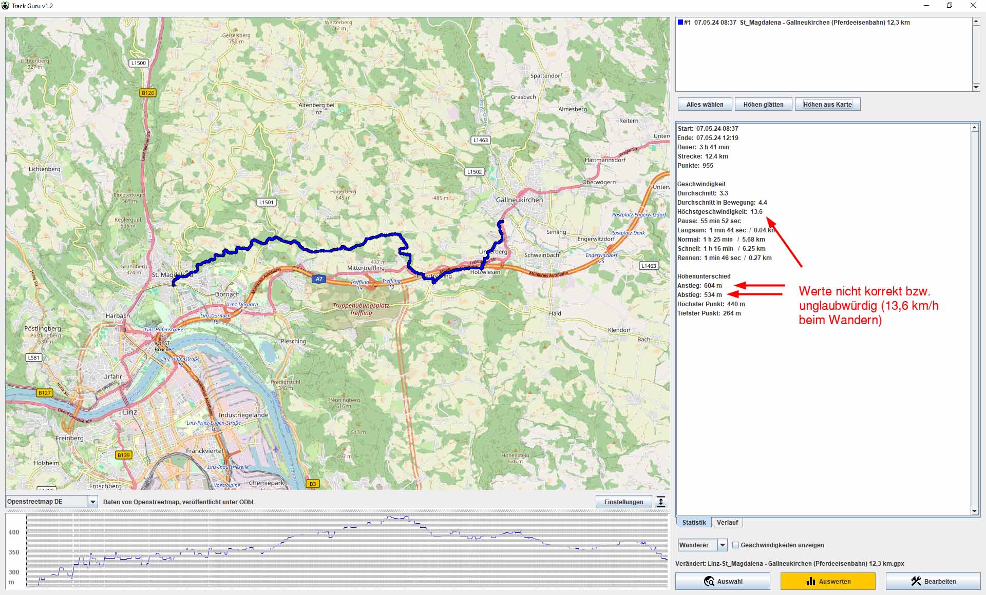 Höhen aus Karte funktioniert. Die ermittelten Werte sind jedoch unglaubwürdig (13,6 km/h Geschwindigkeit beim Wandern, viel zu viele Höhenmeter) und entsprechen nicht den Tatsachen.