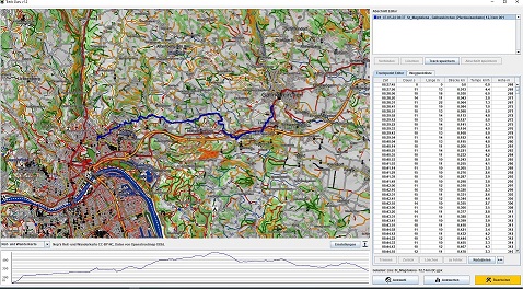Entfernt man diese Zeilen aus dem Track, gibt es jetzt im TG ein Höhenprofil ohne die Linien und schwarze Zahlen. Glätten klappt und auch der Höhen Download liefert eine "glatteres" Profil mit glaubwürdigeren Daten (unabhängig von vielen Diskussionen zu diesem Thema). Einen schönen Sonntag